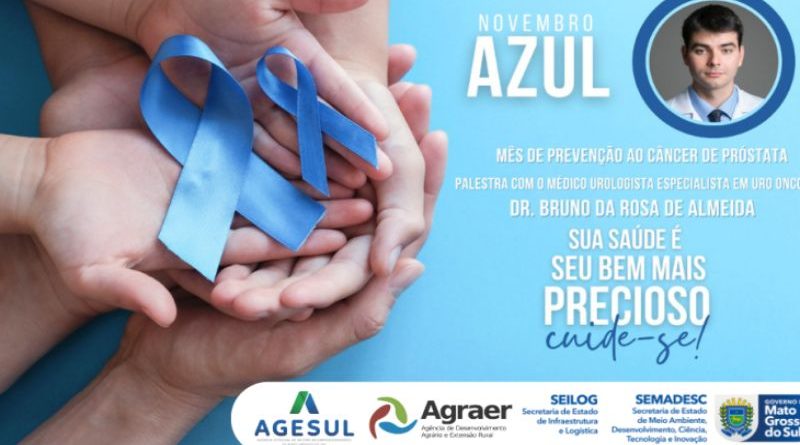 Engajadas na campanha Novembro Azul, a Seilog (Secretaria Estadual de Infraestrutura e Logística) e a Agesul (Agência Estadual de Gestão de Empreendimentos) vão reforçar as discussões sobre a saúde do homem no próximo dia 21, durante palestra com o médico especialista em Uro-oncologia, Bruno da Rosa Almeida. Voltado aos servidores, o evento será realizado às 10h na Agraer (Agência de Desenvolvimento Agrário e Extensão Rural).